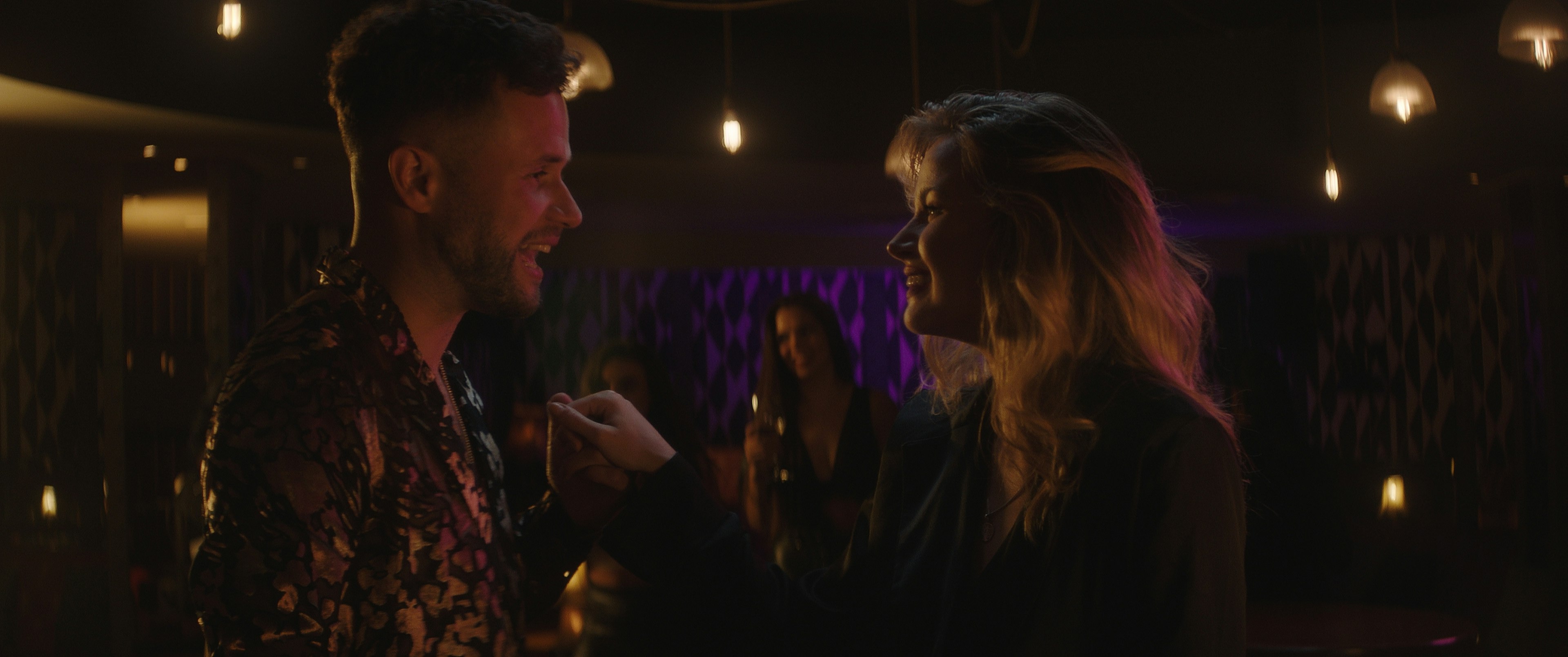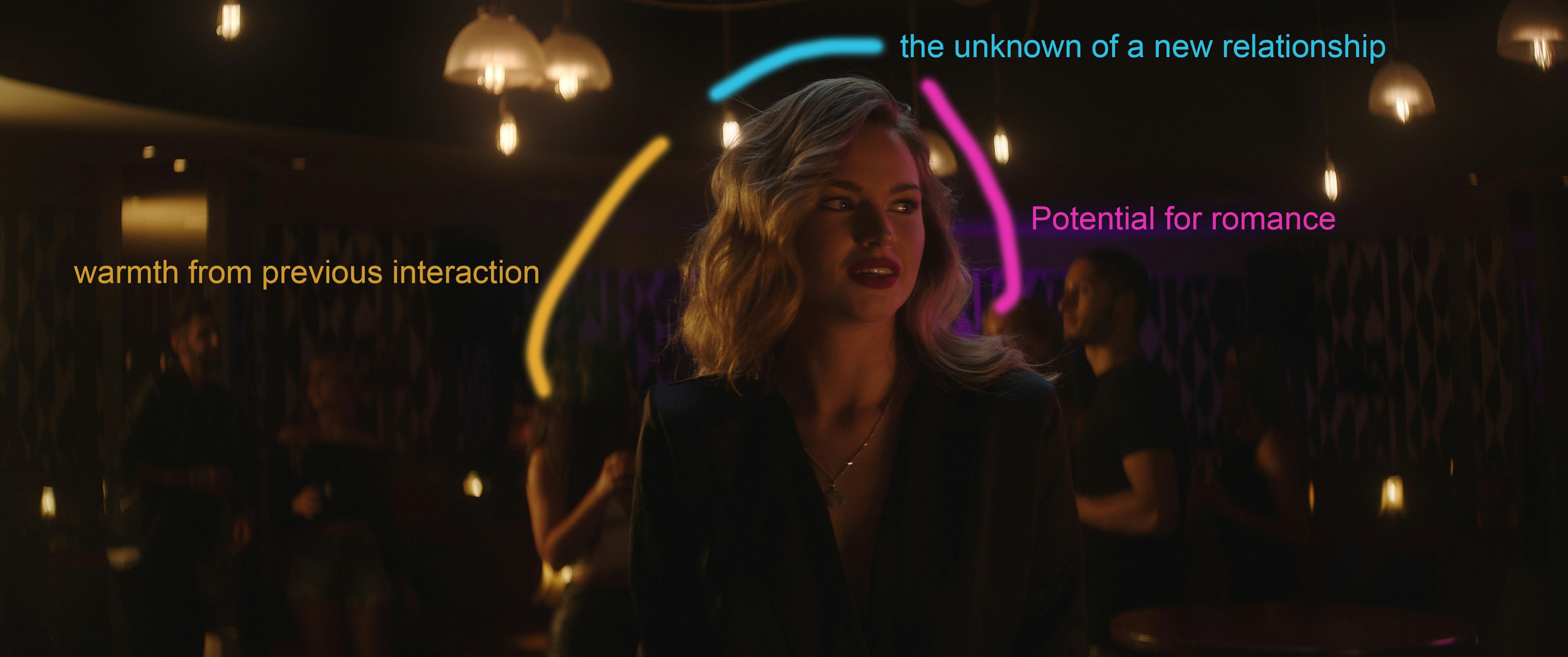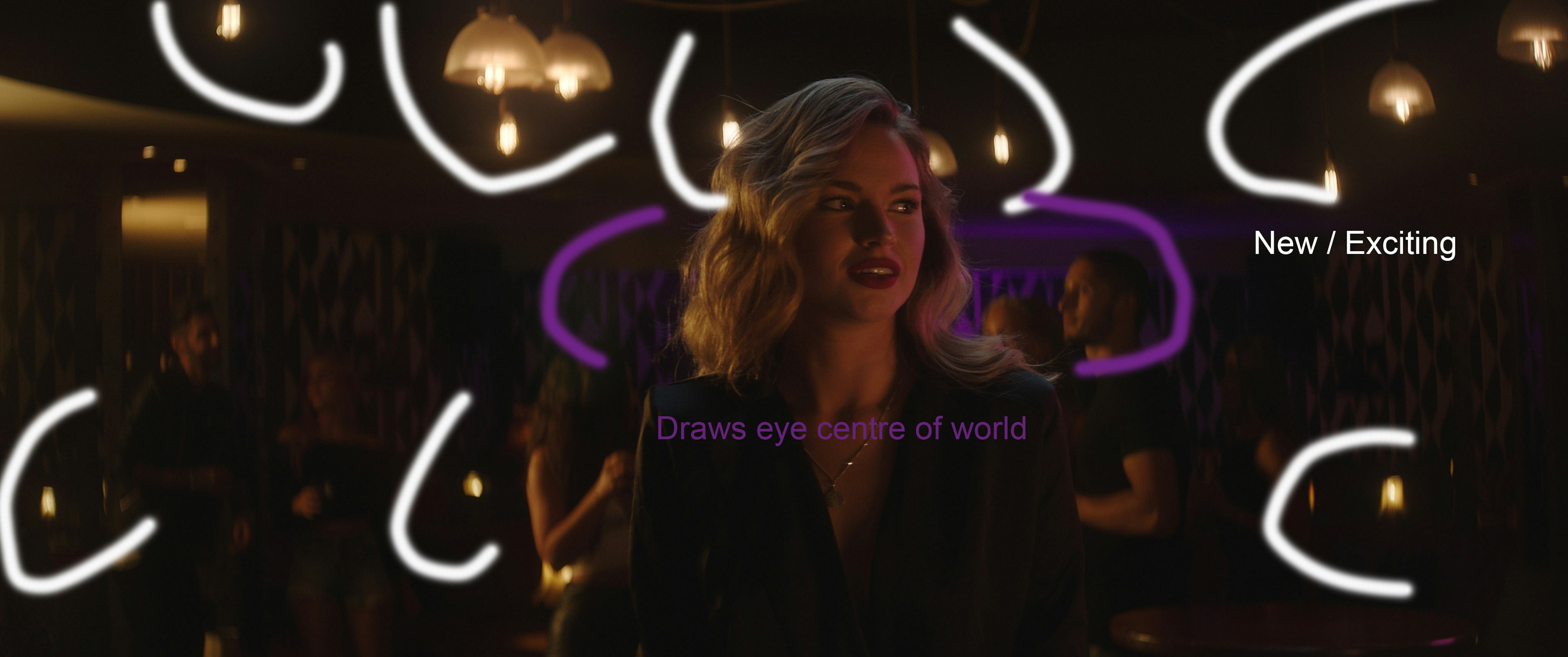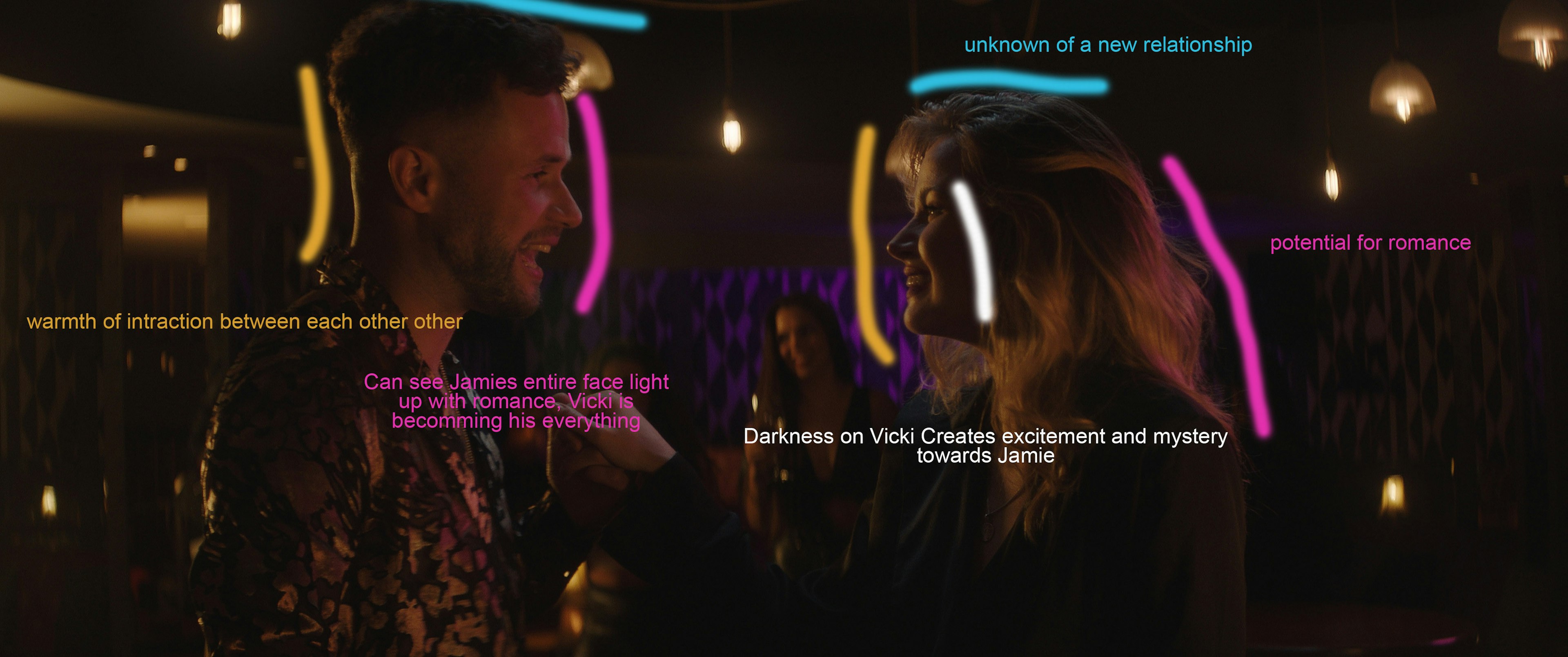 Personally, a sense of wonder and mystery is instantly created, by the incredible layering and exposure to these house lights. It helps bring that sense of heightened fun of a new relationship to the scene. The purple accent light draws your eye center frame to Vicki, again, illustrating that 'love at first sight' wave of emotion, whereby that one person becomes the center of your world view. The purple tones are similar to those seen in British nightclubs, which are often seen as places in which meeting a potential love interest are a likely possibility, and that anything can happen as a result of those interactions.